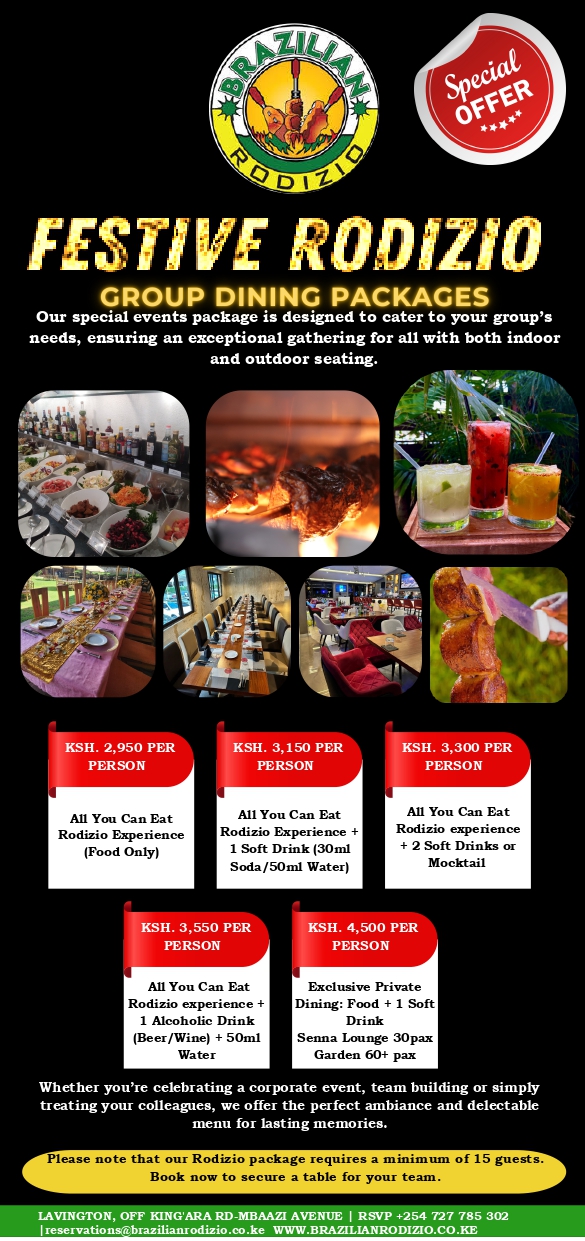 This is the South Brazilian method of grilling meat. This lead to the opening of the leading Churrascaria in East Africa to create this experience. The steakhouse provides customers with excellent Rodizio service in a charming high energy ambience.